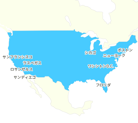 ニューヨーク・ボストン・ワシントンD.C.・サンフランシスコ・ロサンゼルス・ラスベガス・シカゴ・サンディエゴ・フロリダなどアメリカ本土のほぼ全域のエリアをカバーしています。快適なWiFi環境でアメリカ本土でのインターネットをお楽しみください!