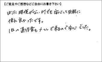 WiFi環境がない所でも安心して気軽に使え良かったです。1日の通信量もメールで来るので安心でした。