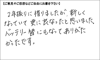 2年振りに借りましたが、新しくなっていて更に良くなったと思いました。バッテリー替にもなってありがたかったです。