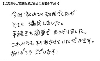 今回初めての利用でしたがとても満足しました。手続きも簡単で助かりました。これからも利用させていただきます。ありがとうございます!