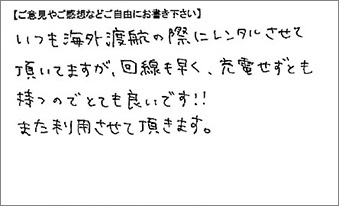 いつも海外渡航の際にレンタルさせて頂いてますが、回線も早く、充電せずとも持つのでとても良いです!!また利用させて頂きます。